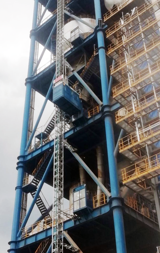 根據(jù)用戶(hù)要求和現(xiàn)場(chǎng)的安裝空間,對(duì)工業(yè)升降機(jī)的轎廂尺寸和運(yùn)行速度,進(jìn)行了定制。由于使用環(huán)境高溫、多塵,轎廂采用了封閉結(jié)構(gòu),在側(cè)板和轎廂門(mén)上設(shè)有觀察視窗,轎廂內(nèi)設(shè)有通風(fēng)系統(tǒng)、照明和應(yīng)急照明系統(tǒng)。驅(qū)動(dòng)機(jī)構(gòu)采用了防護(hù)等級(jí)較高的德國(guó)NORD公司產(chǎn)品。采用了自主研發(fā)的控制技術(shù),配備智能化控制系統(tǒng),可自動(dòng)選平層,實(shí)現(xiàn)無(wú)人駕駛,具有停層精度高、等待時(shí)間短、運(yùn)行效率高的特點(diǎn)。特別提供了應(yīng)急安全自救系統(tǒng),在設(shè)備故障或斷電情況下,乘員在轎廂內(nèi)操縱該系統(tǒng)可實(shí)現(xiàn)迅速自救。主要結(jié)構(gòu)件采用熱鍍鋅處理,防腐效果好,提高了整機(jī)環(huán)境適應(yīng)性,延長(zhǎng)了使用壽命。
