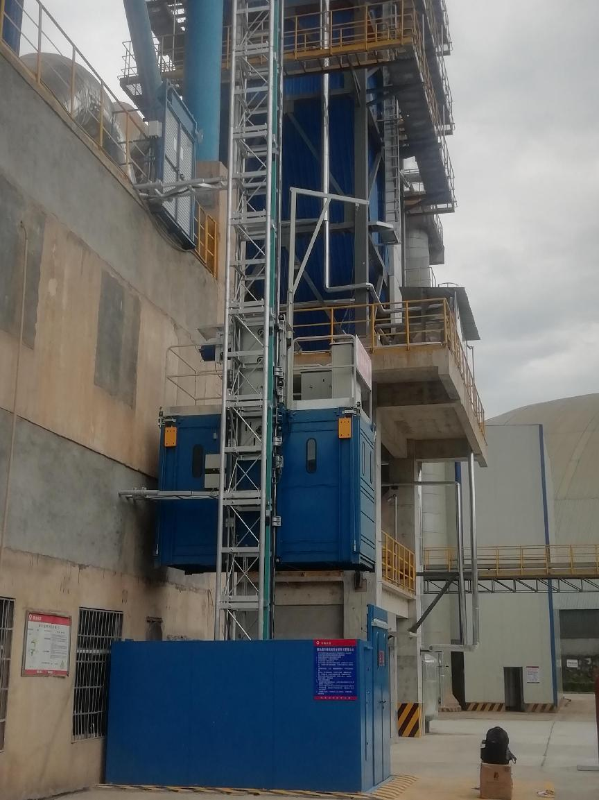 根據用戶要求和現場的安裝空間,對工業升降機的轎廂尺寸和運行速度,進行了定制。由于使用環境高溫、多塵,轎廂采用了封閉結構,在側板和轎廂門上設有觀察視窗,轎廂內設有通風系統、照明和應急照明系統。驅動機構采用了防護等級較高的德國NORD公司產品。采用了自主研發的控制技術,配備智能化控制系統,可自動選平層,實現無人駕駛,具有停層精度高、等待時間短、運行效率高的特點。特別提供了應急安全自救系統,在設備故障或斷電情況下,乘員在轎廂內操縱該系統可實現迅速自救。主要結構件采用熱鍍鋅處理,防腐效果好,提高了整機環境適應性,延長了使用壽命。