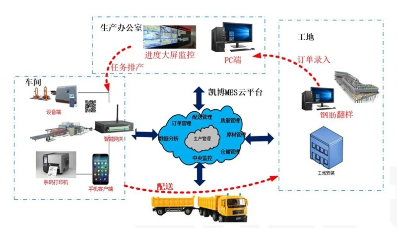 并且,凱博科技攜手中國鐵道科學(xué)研究院集團(tuán)有限公司,開發(fā)凱博鋼筋加工管理軟件系統(tǒng)和鋼筋加工遠(yuǎn)程控制系統(tǒng),打造智能控制中心。鋼筋加工管理軟件系統(tǒng)以鋼筋加工過程中物資流管理為核心,借助工業(yè)互聯(lián)網(wǎng)、云服務(wù)、智能設(shè)備等技術(shù)手段,實現(xiàn)多項目多任務(wù)遠(yuǎn)程訂單管理,實現(xiàn)訂單排產(chǎn)、生產(chǎn)訂單分發(fā)、生產(chǎn)標(biāo)牌打印、成品完成報工,成品出入庫等功能,同時能夠以電子大屏實現(xiàn)項目訂單動態(tài)實時監(jiān)控、加工廠整體運營狀態(tài)的中心化顯示。鋼筋加工遠(yuǎn)程控制系統(tǒng),可實時顯示加工場各種設(shè)備生產(chǎn)狀態(tài),同時實現(xiàn)中控室對現(xiàn)場設(shè)備啟動和停止的遠(yuǎn)程控制,造就了高鐵梁場鋼筋加工數(shù)字化新模式!